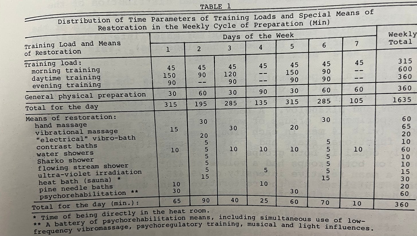 Table 1 describes the means of restoration (recovery modalities) employed by the Soviet Weightlifting National Junior Team with respect to training loads (here, as training time [minutes]) and sums the total daily time spent on recovery. Soviet Sports Review.